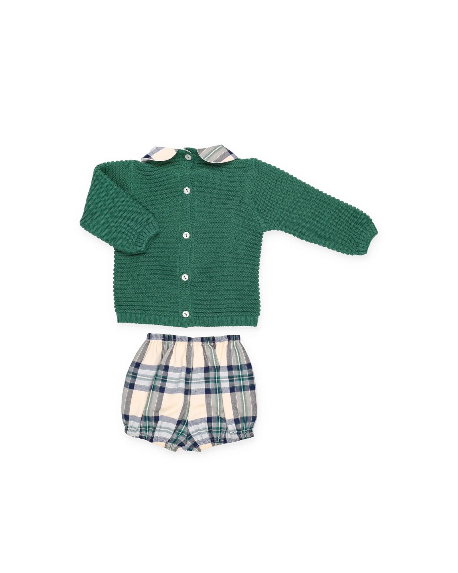 Jersey de punto tricot con dibujo de osito en el delantero y cuello bebé en tejido de cuadro escocés. Se combina con pantalón a juego en el mismo tejido.